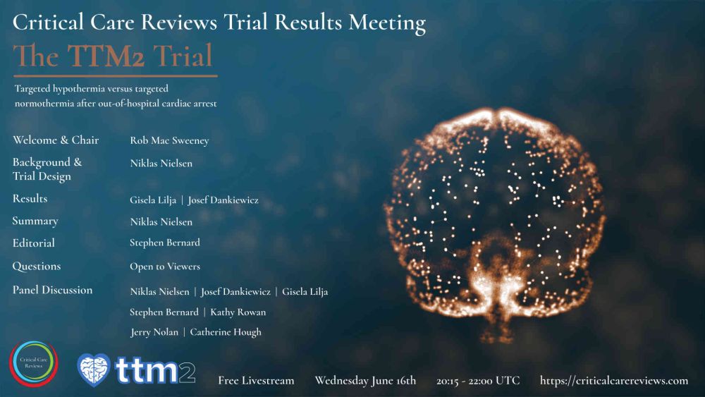 Critical Care Reviews is delighted to announce the hosting of the much anticipated results of the TTM2 trial, on Wednesday night, June 16th, 20:15 to 22:00 UTC. As a follow up to the landmark TTM trial, comparing targeted temperature management of 33°C with 36°C in unconscious survivors of an out-of-hospital cardiac arrest, TTM2 compares a target temperature of 33°C after cardiac arrest with normothermia and early treatment of fever (≥37.8°C). The trial background and results will be delivered by three members of the TTM2 trial team (Niklas Nielsen, Josef Dankiewicz & Gisela Lilja); the editorial will be given by Prof Stephen Bernard, the chief investigator of the original Australian hypothermia trial from 2002; and the panel discussion will include Prof Jerry Nolan (Editor-in-Chief Resuscitation journal and European Resuscitation Council member; Bath, England), Prof Kathy Rowan (Director of ICNARC, London, England), and Prof Catherine Hough (Intensivist & Researcher, Oregon, USA). As usual, this will be a free livestream on the CCR wesite, accessible to all without the need for registration. Please do share this information with your colleagues to maximise the dissemination of the results of this important trial.