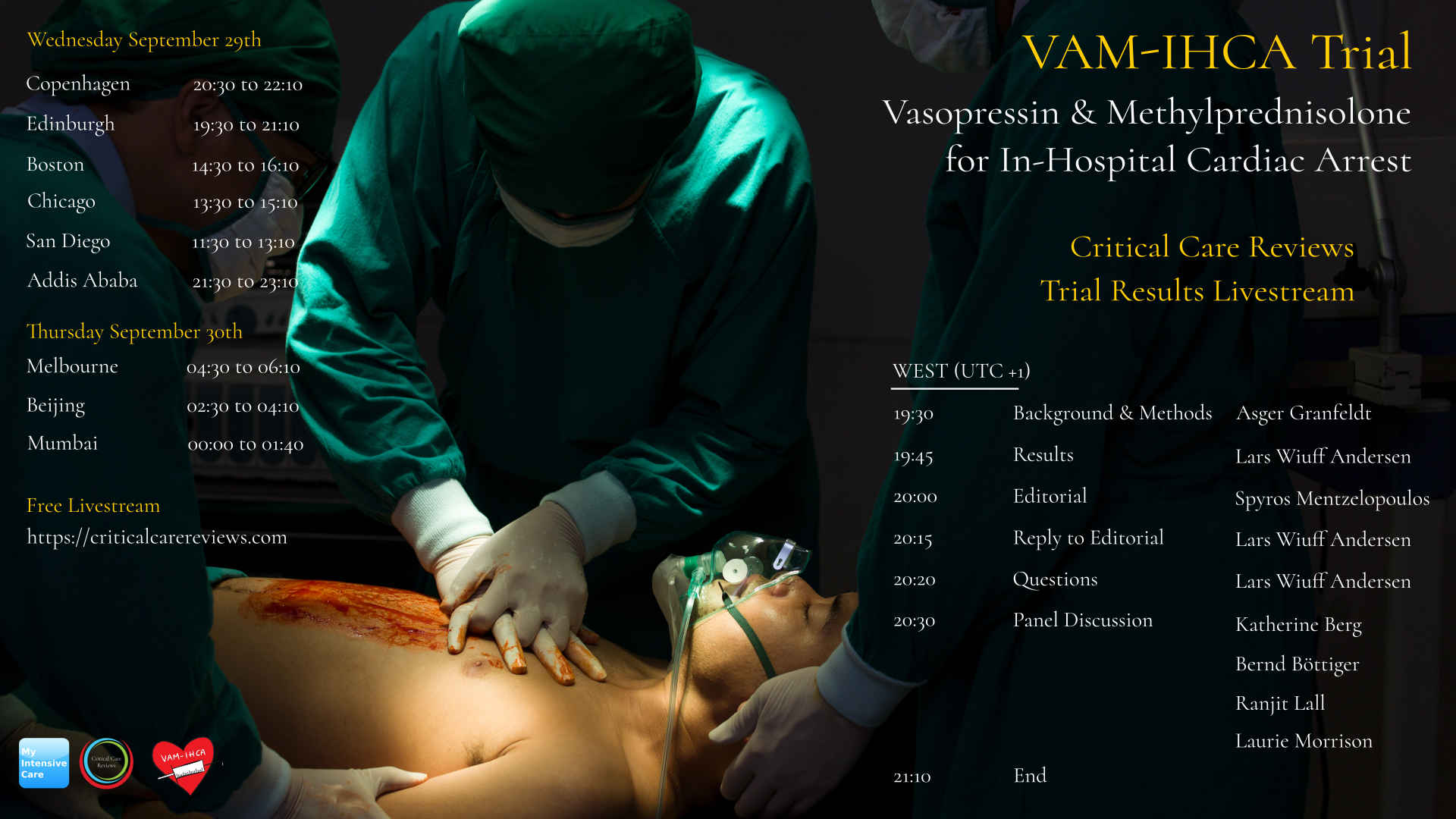 On Wednesday night (Thursday morning in the Pacific and East Asia), Profs Lars Wiuff Andersen and Asger Grenfeldt will present the results of the VAM-IHCA trial, investigating vasopressin and methylprednisolone for in-hospital cardiac arrest. This is the first trial to follow from the VSE trial, which reported improved survival with good neurological outcomes with a combination of intra-arrest vasopressin, adrenaline and methylprednisolone, followed if necessary, by hydrocortisone if post-resuscitation shock persisted. The chief investigator for the VSE trial, Prof Spyros Mentzelopoulos, will deliver the independent editorial on the VAM-IHCA trial. This will be followed by an international panel of cardiac arrest experts discussing the implications of this trial. Your local timings for this free livestream are listed on the livestream webpage.